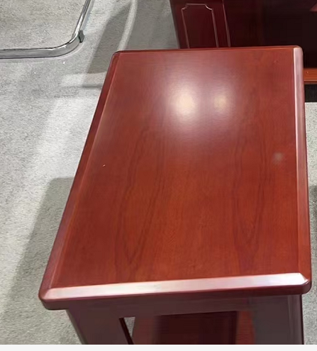 2、面 材:進(jìn)口0.6mm厚天然一級優(yōu)質(zhì)胡桃實木木皮飾面(寬度>200mm), 木皮紋理清晰自然,顏色均勻平整;環(huán)保工藝:人造板件全部雙飾面,封四邊,走線孔內(nèi)緣及隱蔽部位均封閉處理;臺面面板兩面雙貼木皮,兩面均衡油飾。